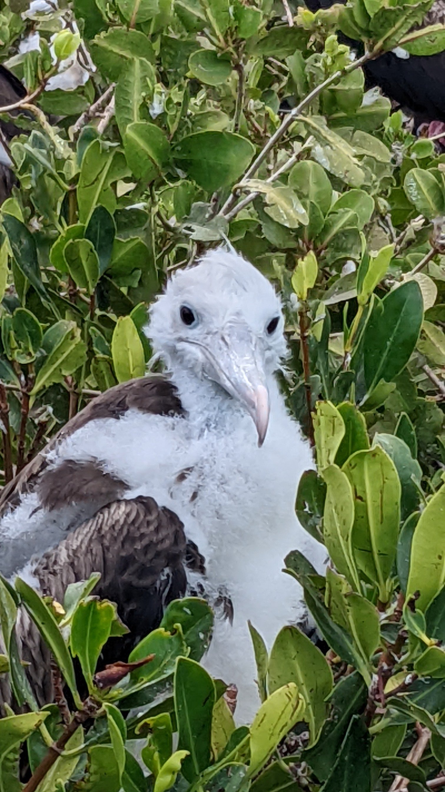We have an appointment with SV Luna to visit the Frigate Bird Sanctuary in the lagoon. George is supposed to be our guide. We can't reach him, but we are confident to find him at the Dinghidock on Easter Sunday at 10am. But before we can start, we first have to cross the lagoon and, above all, get into it. According to Navionics (our digital sea chart) there is a dinghy passage. We bravely head towards it, but it is not easy to find the opening because of the breaking waves. We bravely steer through and get completely wet. Several waves break into the dinghy, we are scooping at maximum speed, we try our way through the waves head-on, diagonally across, no matter, we get wet and wetter. We have never had a more spectacular dinghy ride. When we arrive, we first have to change (it's a good thing that we actually packed a change of clothes for all 5 family members, as recommended by other sailors). The Luna Dinghy also arrives completely soaked. But luckily we meet George, who routinely drives us through the lagoon with his big dinghy and 60 hp outboard motor. He tells us about Barbuda, drives us through the mangroves and brings us so close to the frigate birds that we could reach into their nests. Which, of course, we don't. We learn to distinguish the young birds (white) from the juveniles (white head), from the females (grey) and the males (red throat). For 5-6 months the young birds stay in the nest and the parents bring "flying fish" as food, several times a day they fly to the Atlantic side to catch 4-5 flying fish and then bring them to the young birds. They first trick the fish by flying close and when the fishs fly, they catch them in the flight. Madness, this nature!